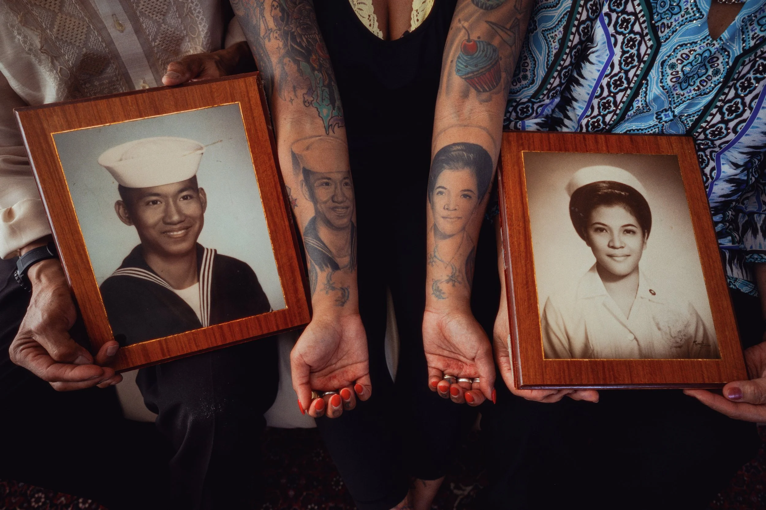 Danny (left) and Vicky Villanueva (right) hold portraits of themselves from around the time they began exchanging letters. Their daughter, Aims (center), shows off her tattoos of her parents’ portraits. (Photo by Joshua Albeza Branstetter)